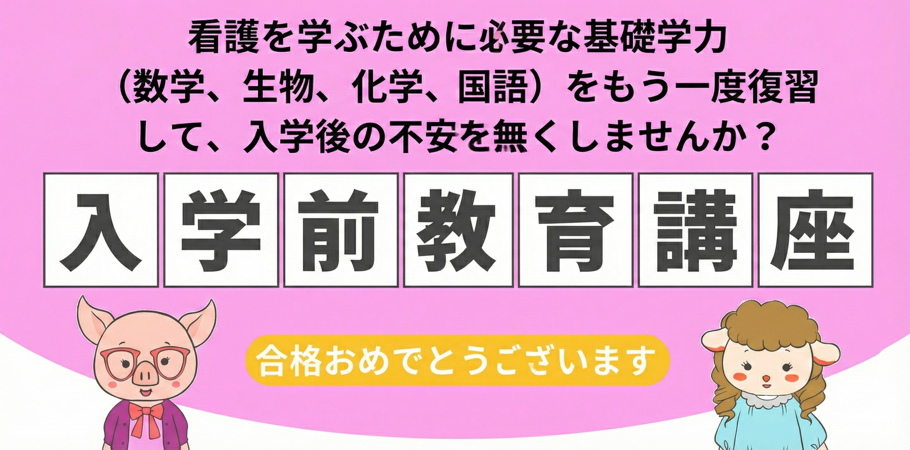 看護学校・大学も入学するとまず解剖学や生理学、薬の単位計算や医療専門用語などさまざまなことを学習します。 学習するにあたり基本的には中学・高校で学習した内容を理解していれば問題ありません。 しかし、これらの科目に対し苦手意識を持っていたり、入学後の学習に不安がある方も多いのではないでしょうか? そのような方は入学までの間に本講座を活用し、しっかりと復習しておくことをおすすめします 本講座は受講開始から6か月間受講可能な講座となっています。 そのため、入学後に学校の勉強が難しいと感じてから学習することも可能です。 但し、本講座は申込可能な期間が決まっています。 申込期間:入学前年度の12月1日~入学年度の4月30日まで